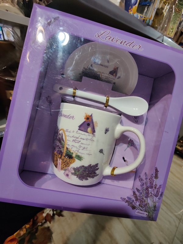 Ceramiczny zestaw w stylu prowansalskim. Uroczy kubek o pojemności 330ml ozdobiony romantycznym motywem lawendy. Komplet zawiera dopasowaną podstawkę z identycznym wzorem oraz porcelanową łyżeczkę