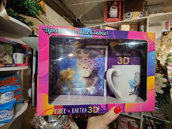 W skład zestawu wchodzi: kubek ceramiczny o pojemności 300ml oraz kartka 3D z kopertą. Całość zapakowana w ozdobny kartonik. Idealnie nada się na każdą okazje