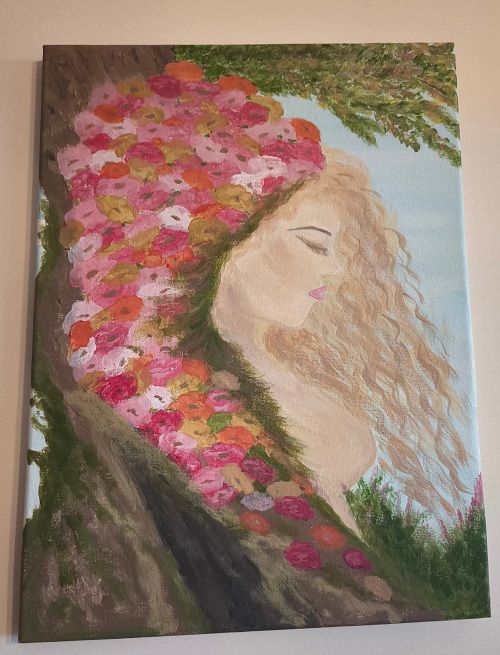 Delikatna blondynka o zamkniętych oczach, której włosy przemieniają się w bujny wianek z różnobarwnych kwiatów – różowych, pomarańczowych, żółtych i fioletowych płatków, splatających się z gałęziami drzewa.