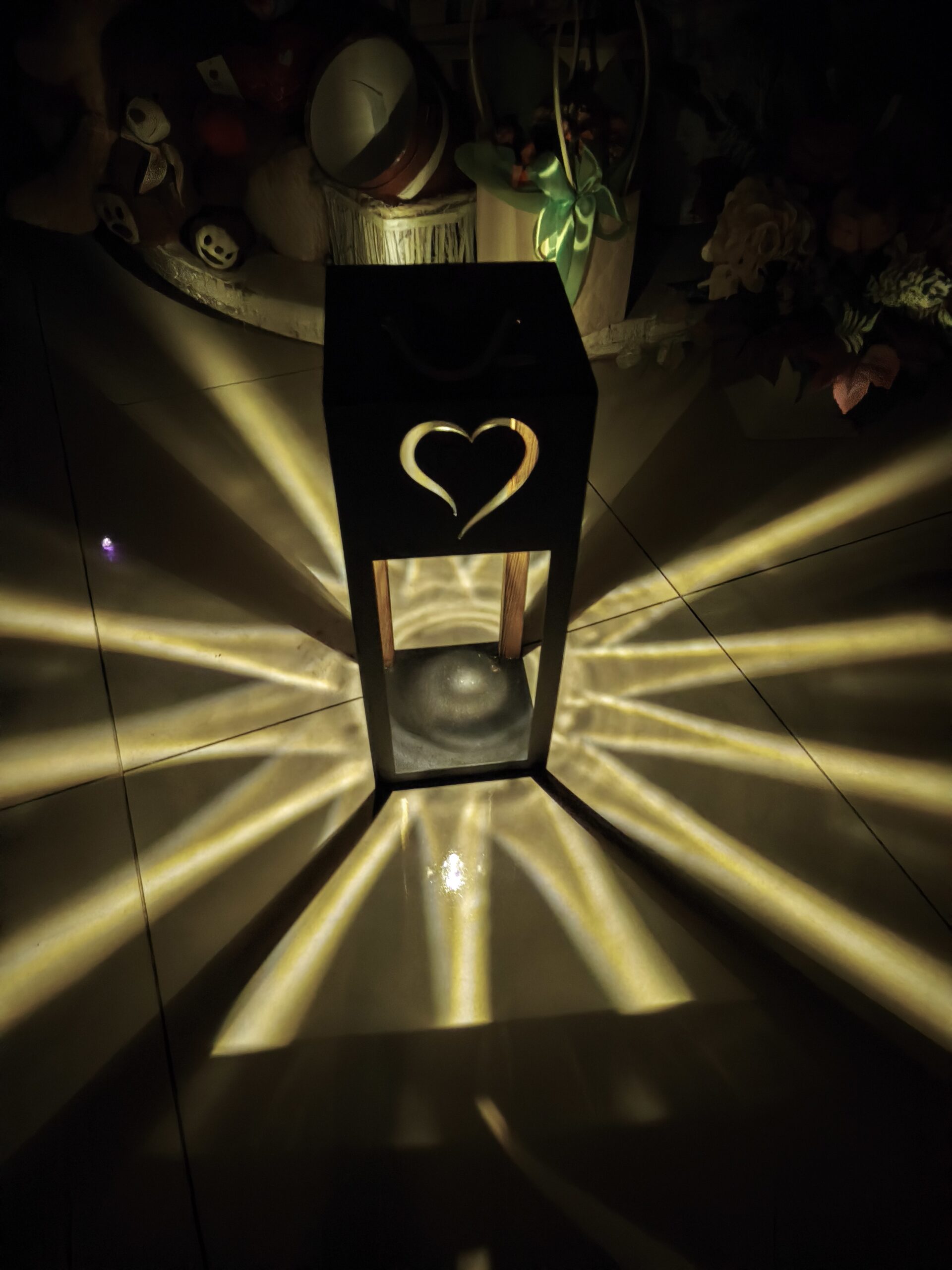 Lampion ten skonstruowany jest z metalowych elementów w kolorze czarnym oraz drewnianych wstawek dekoracyjnych. Na górze lampionu znajduje się panel fotowoltaiczny z wmontowaną diodą LED i mini kloszem oraz dekoracyjny i praktyczny sznurkowy uchwyt by ułatwić jego przemieszczanie. We frontowej części lampionu znajduje się wycięty laserowo wzór serca ,który to podczas świecenia się lampionu dodaje dodatkowy efekt świetlny. Pod spodem lampionu znajdują się gumowe stopki ,które mają na celu zapobiec porysowaniom pomnika czy kafelek.