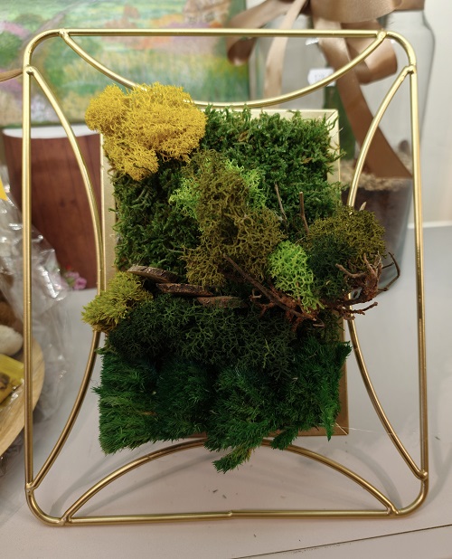 Ten kompaktowy obrazek to prawdziwy kawałek lasu zamknięty w eleganckiej, geometrycznej ramie z metalu w kolorze szczotkowanego złota. Gęsta, wielowarstwowa kompozycja z mchu stabilizowanego w odcieniach głębokiej zieleni, butelkowej i oliwkowej tworzy bujny, żywy pejzaż. Na pierwszym planie żółciutki, puszysty chrobotek kontrastuje z ciemniejszymi porostami, a całość dopełniają naturalne gałązki, cienkie patyczki i kawałki kory – dodają surowości i autentycznego, leśnego klimatu.