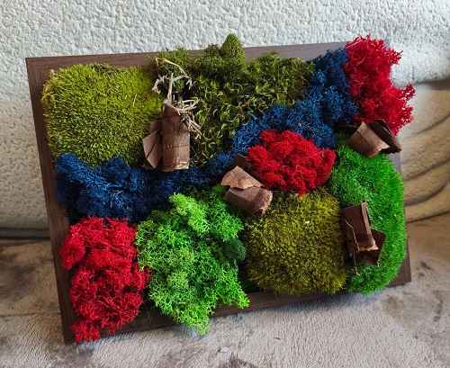 Efekt bardzo nowoczesny i energetyczny – wygląda jak mały, kolorowy „las” zamknięty w ramce. Idealna dekoracja ścienna w stylu boho, modern nature albo jako akcent kolorystyczny w minimalistycznym wnętrzu. Wieczna, bezobsługowa roślina.