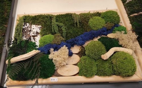 Kompozycja oparta na kontraście głębokiej zieleni runa leśnego i intensywnego, granatowo-niebieskiego potoku z mchu islandzkiego, który wije się przez cały obraz niczym żywa rzeka.