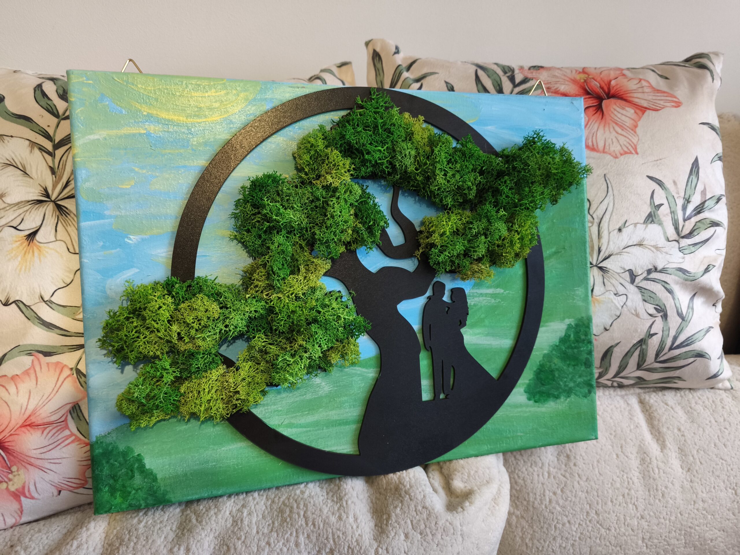 Obraz wykonany na płótnie ,ręcznie malowany z drewnianym czarnym motywem pary kobiety i mężczyzny pod dużym drzewem na tle słonecznej i zielonej natury ,które to jest pięknie wyklejone i ubarwione na zielono naturalnym mchem chrobotkiem. Całość kompozycji jest starannie i estetycznie wykonana.