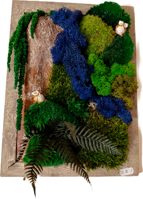 Obraz z naturalnego mchu chrobotka oraz roślin stabilizowanych. Obraz wykonany jest w drewnianej ramie z wielu gatunków mchu ,chrobotka w kilku kolorach ,poduszkowca, paprociowego i paproci stabilizowanej. Kompozycja ta to krajobraz przedstawiający wodospad z wysokiej skały pośród przepięknej zieleni.
