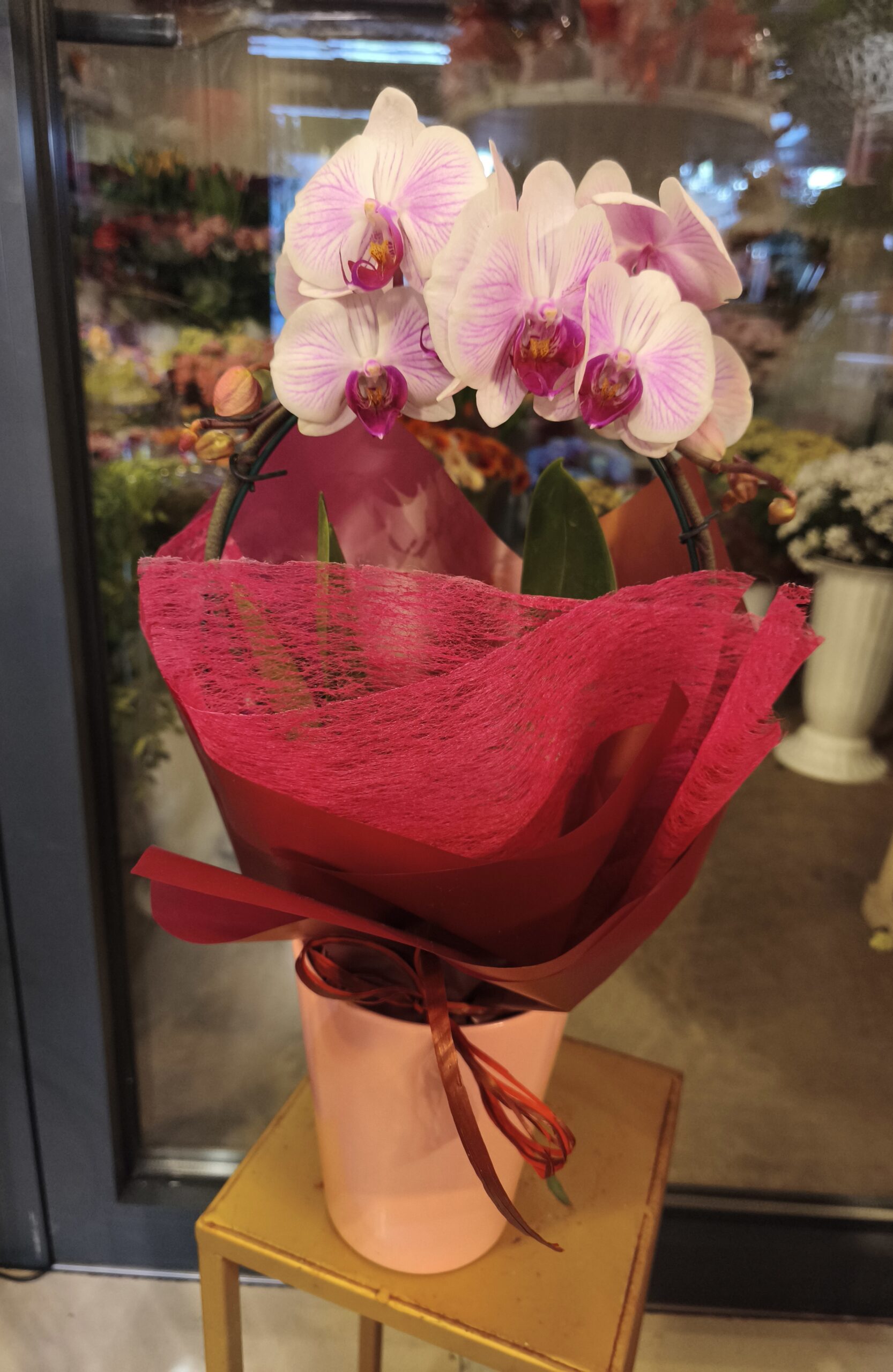 Storczyk to bardzo elegancki kwiat doniczkowy kwitnący. Jest to roślina wieloletnia. Posiada dwa pędy kwiatowe umieszczone na stelażu w kształcie pół koła .Ma po kilka kwiatów oraz pączków kwiatowych na każdym z pędów. Posiada eleganckie podłużne liście w kolorze ciemnozielonym o strukturze skórzastej. Kwitnie bardzo długo. Jest to dostojny elegancki jak i zarówno delikatny kwiat idealny prawie na każdą okazję .