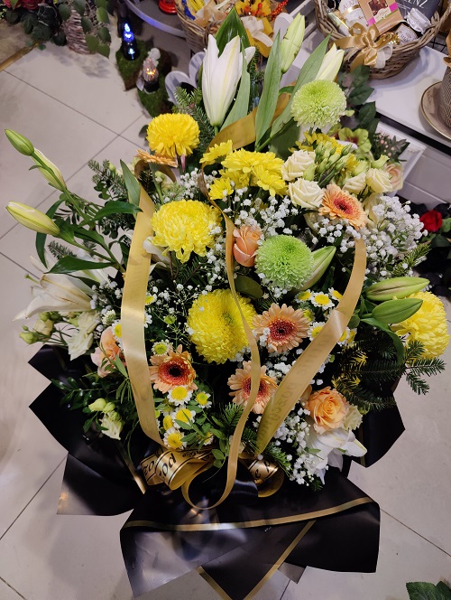 Dominują żółte i kremowe chryzantemy drobnokwiatowe, białe lilie (orientalne), delikatne gerbery w odcieniach żółci i kremu oraz drobne białe santini. Uzupełnieniem jest obfita biała gipsówka nadająca lekkości, bujna zielona zieleń (m.in. liście asparagusa, paprocie i gałązki iglaste) oraz subtelne akcenty kremowych róż. Całość owinięta w czarny papier florystyczny z szeroką złotą wstążką – wytworna, dostojna i pełna harmonii.