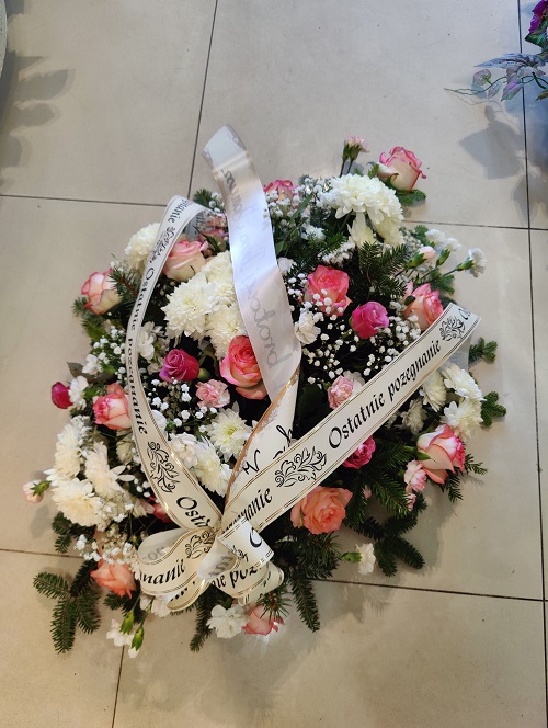 Dominują różowe i kremowe róże w różnych stadiach rozkwitu, białe chryzantemy drobnokwiatowe oraz obfita biała gipsówka nadająca lekkości. Uzupełnieniem jest bujna zielona zieleń (m.in. iglaste gałązki i liście). Całość udekorowana białymi szarfami z czarnym napisem „Ostatnie pożegnanie” – pełna, harmonijna i dostojna kompozycja.