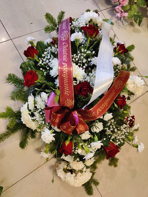 Dominują głębokie czerwone róże oraz białe chryzantemy drobnokwiatowe, uzupełnione obfitą białą gipsówką dla delikatności i bujną zielenią (m.in. gałązki iglaste). Całość udekorowana szerokimi szarfami w odcieniach różu i czerwieni z napisem **”Ostatnie pożegnanie”** – dostojna, pełna i bardzo elegancka kompozycja.