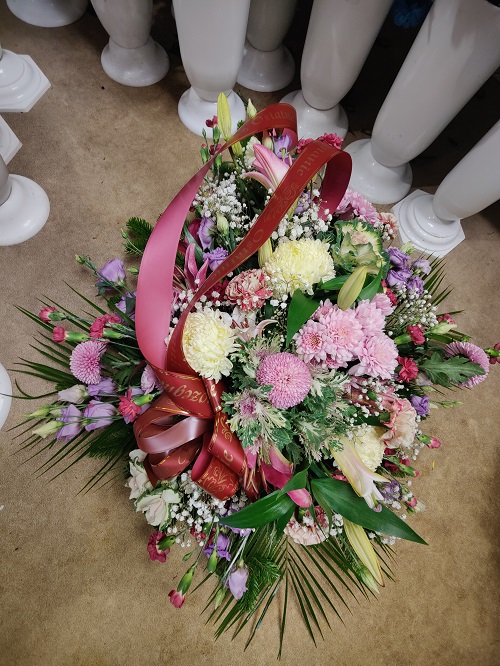 Dominują białe i kremowe chryzantemy drobnokwiatowe, różowe i fioletowe goździki, lilie orientalne w odcieniach różu i bieli oraz tulipany. Kompozycję uzupełnia obfita biała gipsówka dla lekkości, bujna zielona zieleń (m.in. asparagusa, paproci i iglaste gałązki) oraz subtelne akcenty drobnych kwiatków. Całość udekorowana szeroką, czerwono-różową wstążką z napisem (prawdopodobnie kondolencje) – pełna, harmonijna i pełna szacunku.