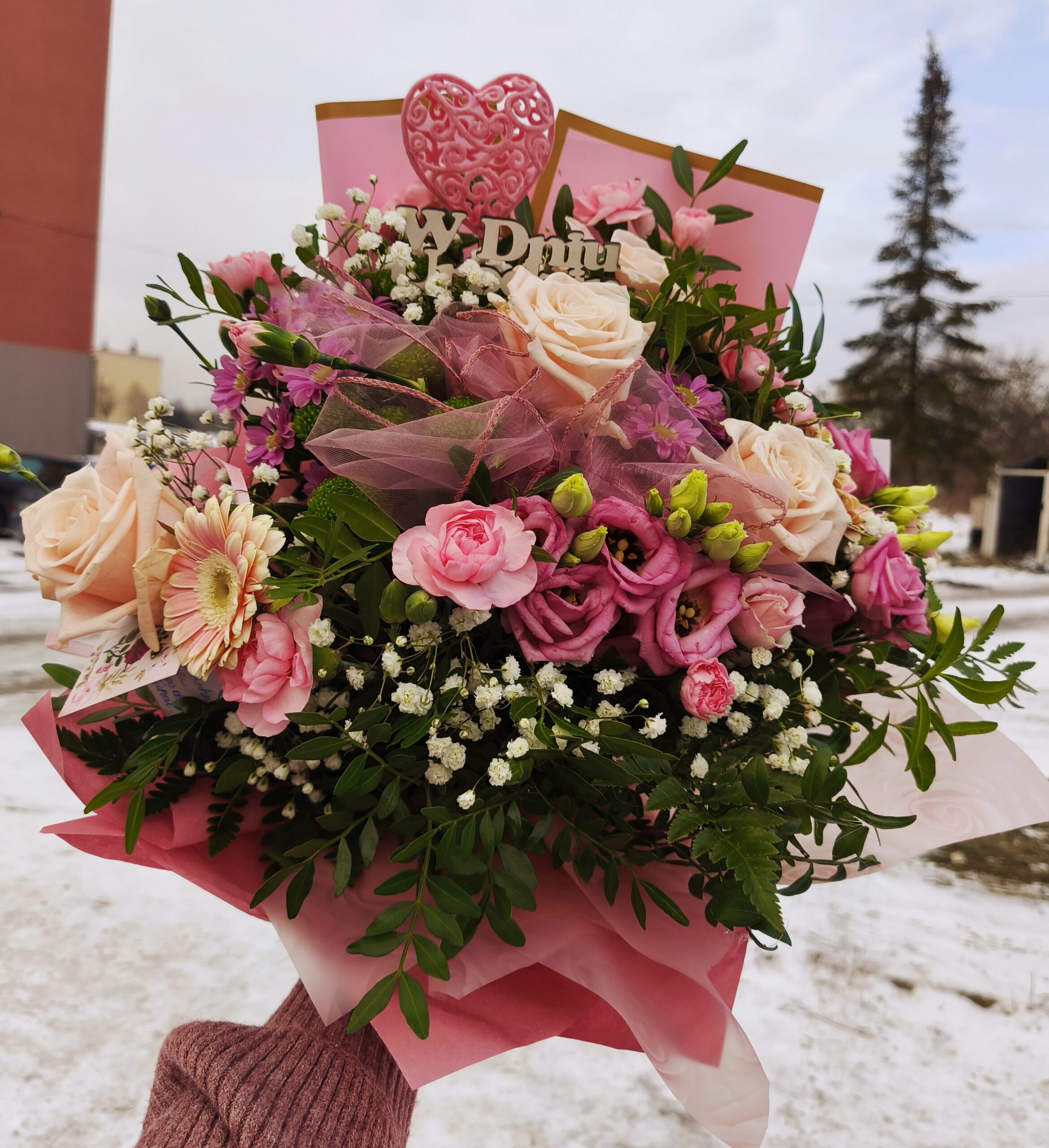 Delikatny, romantyczny bukiet utrzymany w pastelowych odcieniach różu i kremu, skomponowany z róż, drobnych kwiatów sezonowych oraz subtelnej zieleni. Całość dopełniają dekoracyjne dodatki i stylowe opakowanie, które nadają kompozycji wyjątkowo ciepły i elegancki charakter.