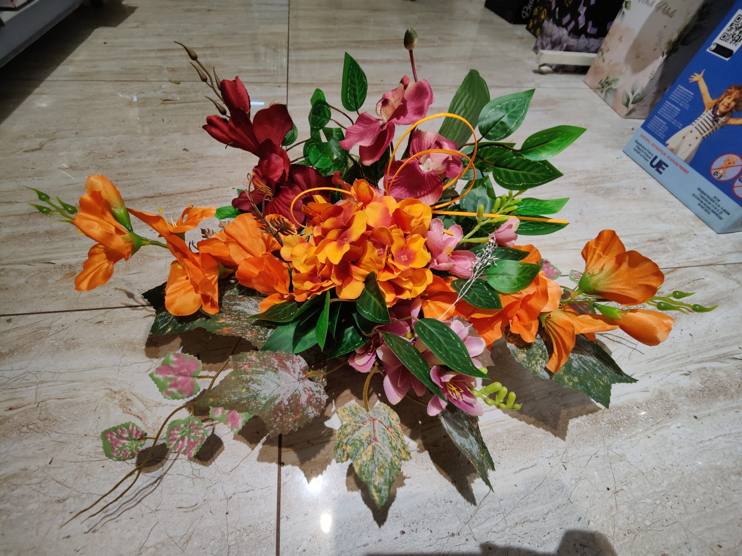 Piękny stroik z żywymi kolorami, składający się głownie z pomarańczowych i czerwonych kwiatów, uzupełnionych zielonymi liśćmi. Na nagrobku będzie prezentował się elegancko i naturalnie