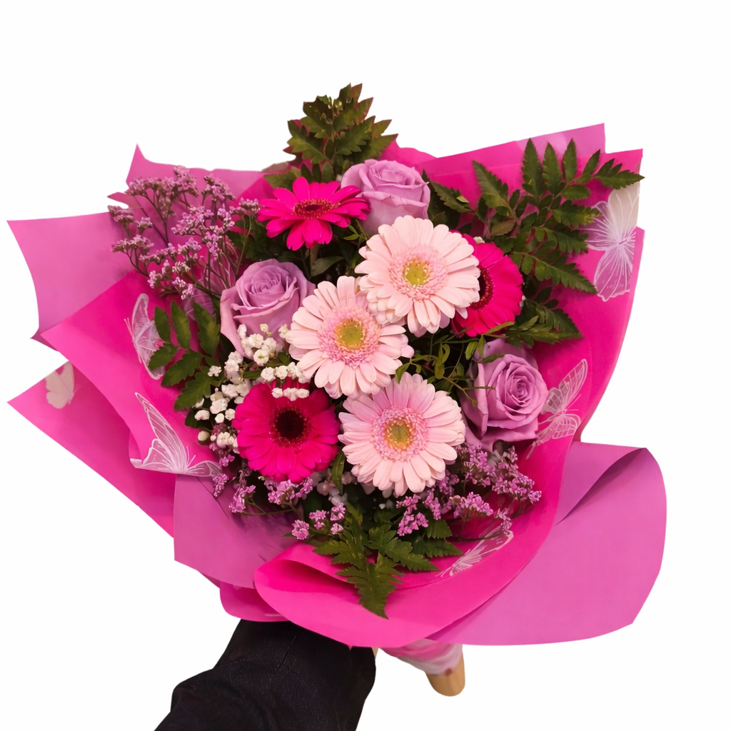Romantyczny bukiet w odcieniach różu i fioletu, skomponowany z delikatnych gerber, eleganckich liliowych róż oraz subtelnego limonium, uzupełniony świeżą zielenią dekoracyjną. Całość tworzy harmonijną, lekką kompozycję idealną na każdą wyjątkową okazję.