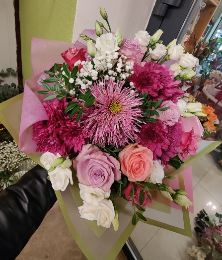 Dominują różowe i fioletowe róże, białe eustomy oraz okazałe różowe chryzantemy. Lekkości dodaje obfita biała gipsówka oraz rośliny zielone. Całość owinięta w pastelowy różowy papier florystyczny –bukiet świeży, elegancki i bardzo kobiecy!