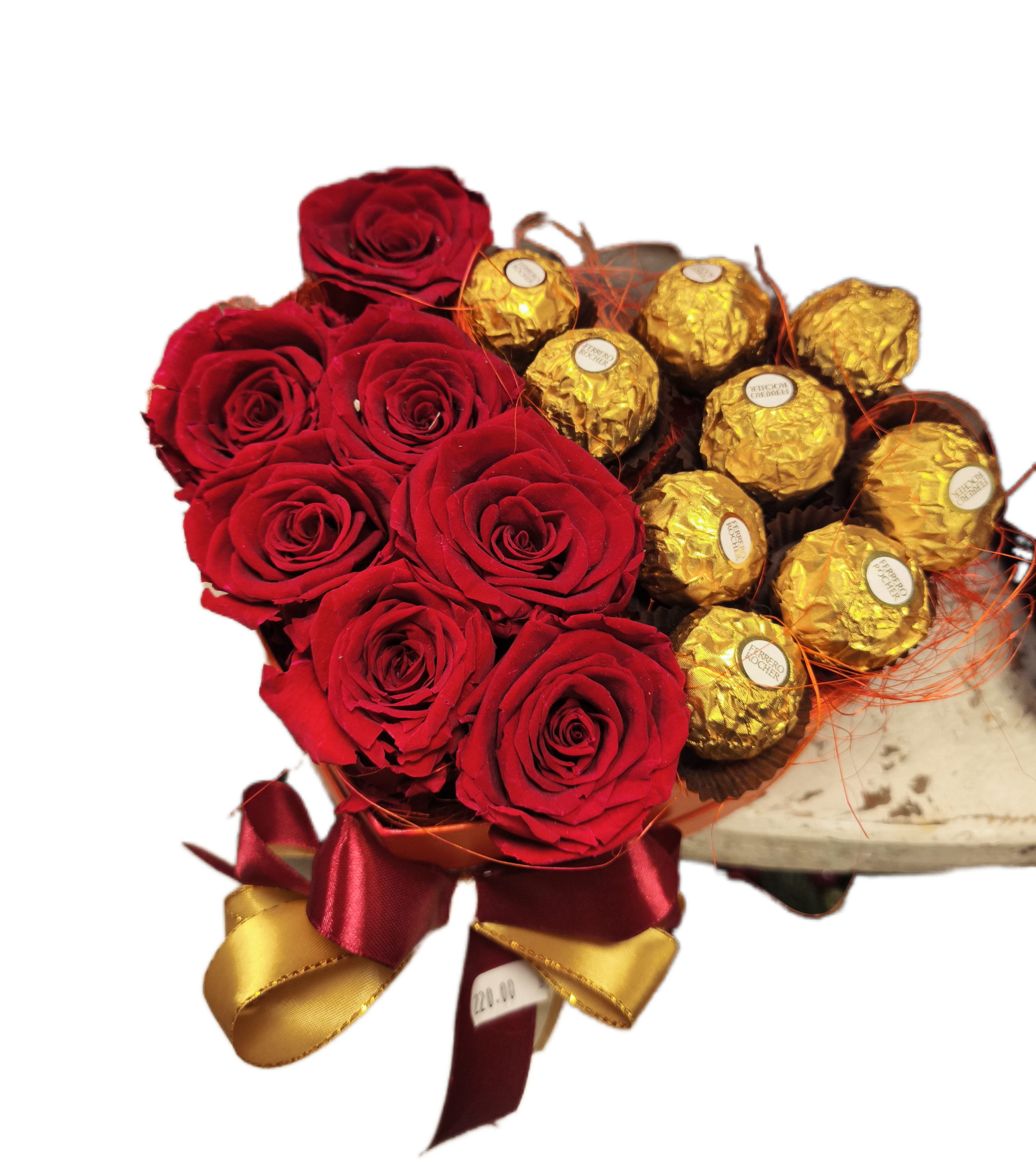 Wyjątkowy bukiet łączący klasyczną elegancję czerwonych róż z luksusowym smakiem czekoladek Ferrero Rocher. Kompozycja w kształcie serca zachwyca wyglądem i stanowi idealny sposób na wyrażenie uczuć w niebanalny sposób.