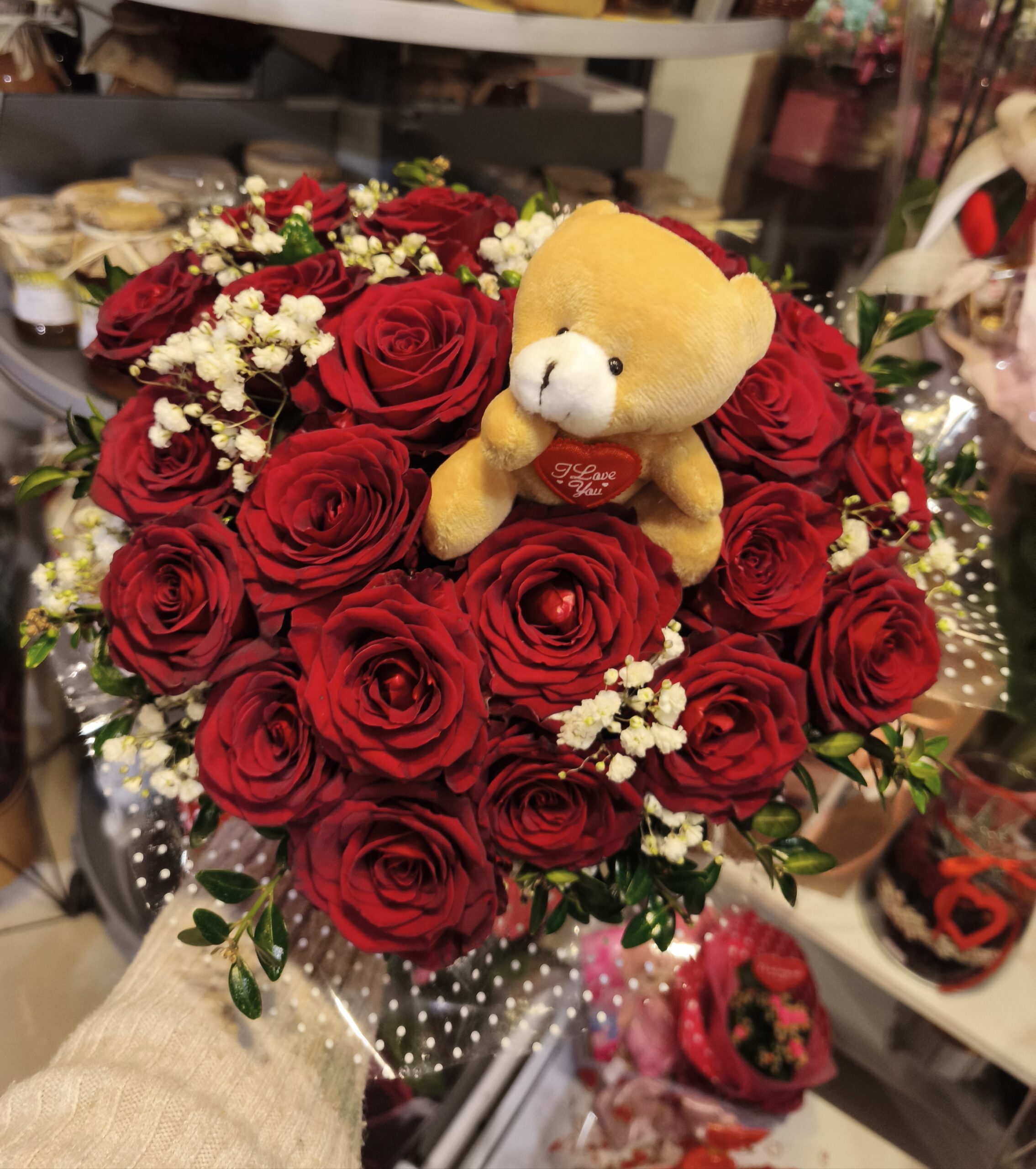 Flower box z różami czerwonymi i misiem, skomponowany jest w czerwonym pudełku w krztałcie serca z 21 sztuk czerwonej róży dobrego gatunku z dodatkiem białej gipsówki oraz brązowym misiem trzymającym serduszko.Kwiaty oraz dodatki umieszczone są w mokrej gąbce florystycznej która utrzymuje kwiaty w dostępie do wody oraz dodatkowo ma właściwości przedłużające żywotność kwiatów. Kompozycja ta wyraża miłość ,sympatię i przyjażń do drugiej osoby. Kompozycje ta będzie idealnym prezentem dla kobiety.