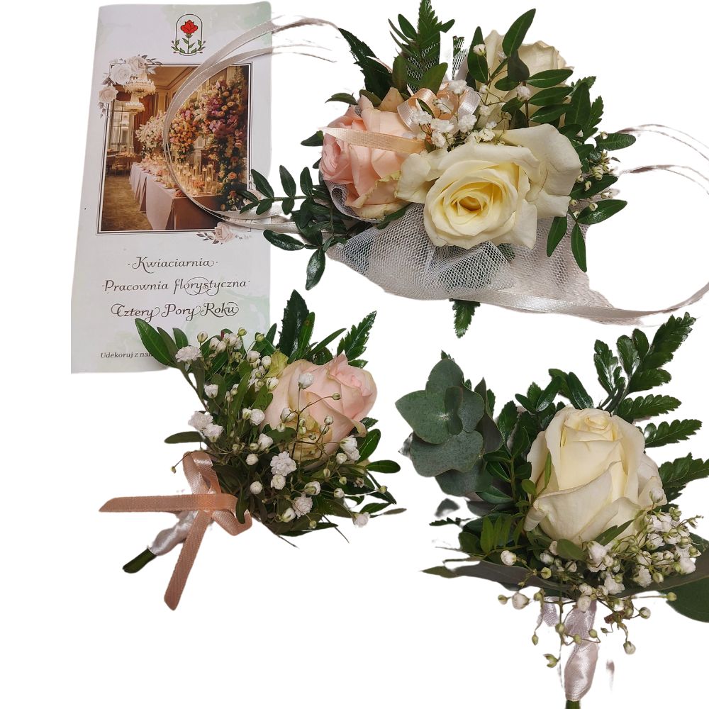 - Kompozycja kwiatowa: Delikatne, romantyczne kwiaty, np. mini róże, frezje, alstremerie, uzupełnione gipsówką i dekoracyjną zielenią.