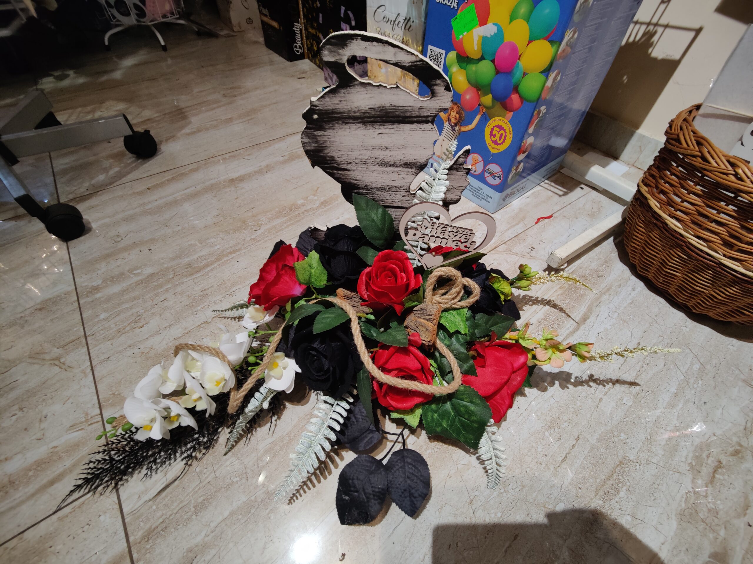 Ten elegancki stroik zachwyca połączeniem czerwonych i czarnych róż oraz białych orchidei. Udekorowany zielonymi liśćmi i szarymi piórami, opleciony sznurkiem jutowym, a całość wieńczy drewniana tabliczka z napisem ” Wieczna pamięć „. Subtelny a zarazem wyrazisty akcent