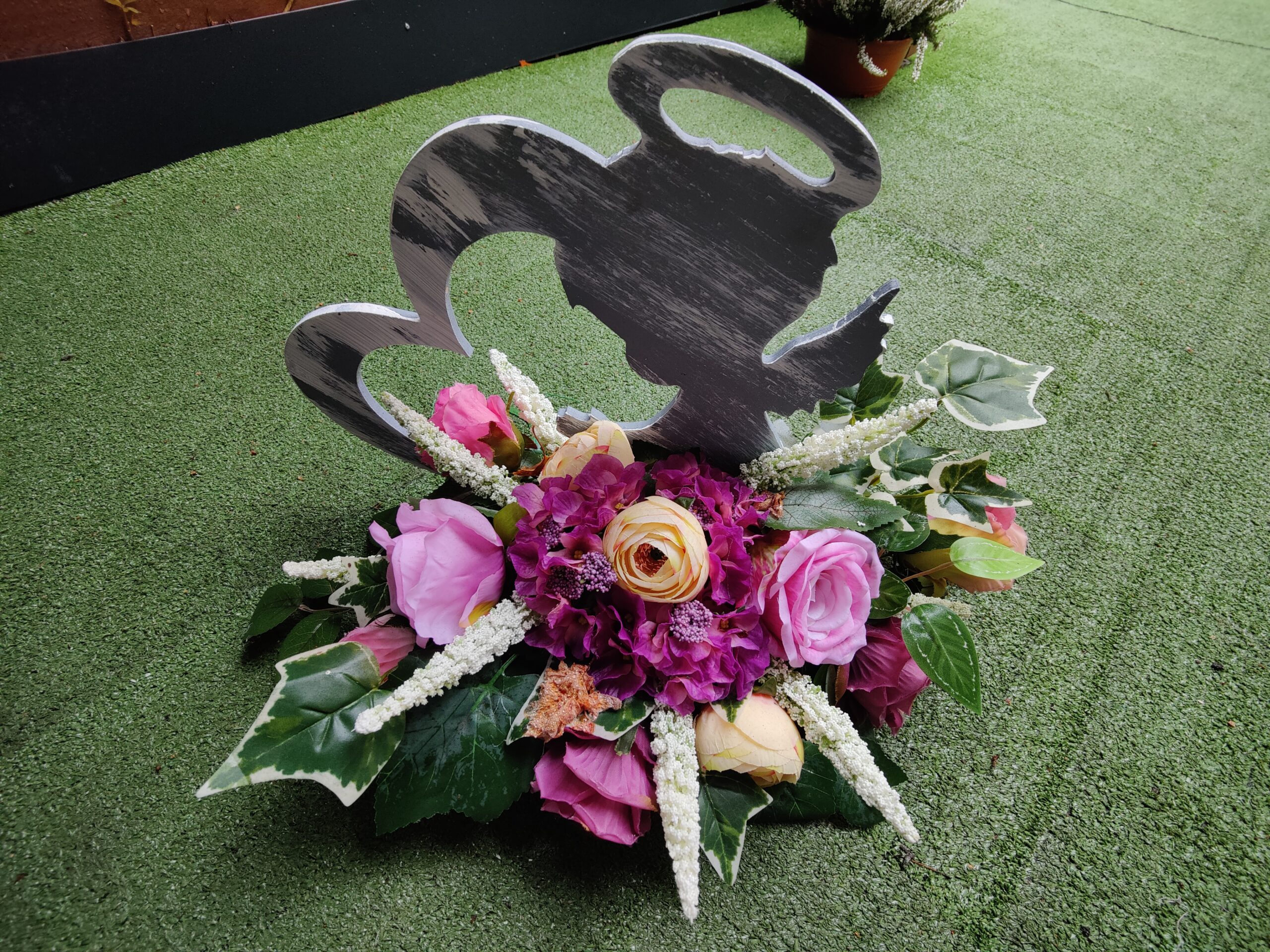 Ta urocza kompozycja kwiatowa zachwyca harmonijnym połączeniem kolorów i form. W jej centrum znajduję się drewniana sylwetka anioła z delikatnym nimbem, dodającym symboliki spokoju i pamięci. Podstawa zdobiona jest bogatym bukietem sztucznych kwiatów w odcieniach różu, fioletu i delikatnej żółcieni, wśród których wyróżniają się puszyste różyczki, subtelne chryzantemy i eleganckie hortensje. Całość uzupełniają zielone liście z białymi akcentami oraz długie, zwiewne gałązki, które dodają lekkości i naturalnego uroku