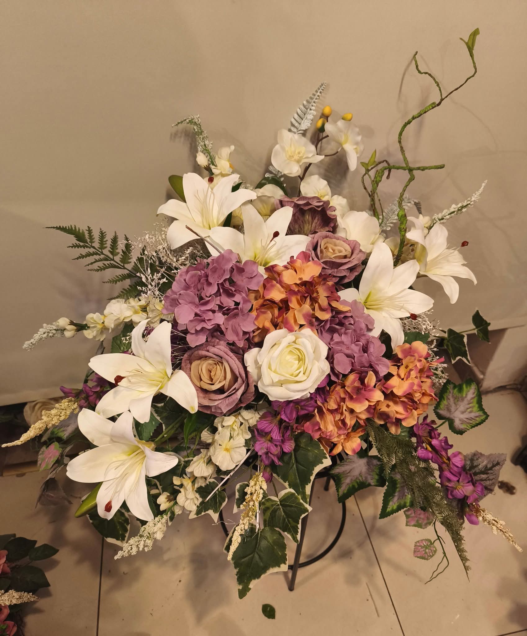 Ten uroczy stroik zachwyca delikatnym połączeniem białych lilii, różowych i pomarańczowych hortensji oraz subtelnych róż. Zielone liście bluszczu oraz zwiewne gałązki dodają świeżości, tworząc harmonijną i elegancką dekoracje