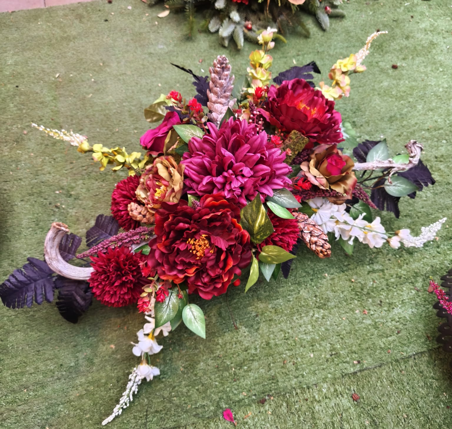Ten stroik wyróżnia się bogatą kompozycją z dominującymi czerwonymi i bordowymi piwoniami oraz daliami, uzupełnionymi żółtymi i złotymi akcentami. Dekorację wzbogacają białe kwiaty, zielone liście, a także naturalne elementy takie jak bielone drewno i szyszki, dodające rustykalnego charakteru