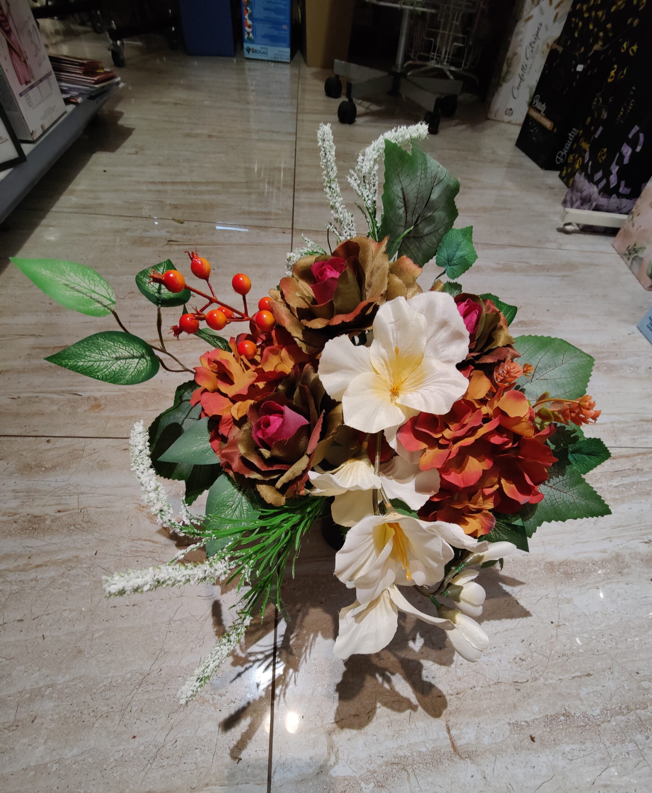 Ten stylowy stroik zachwyca ciepłą paletą barw i naturalnym urokiem. Składa się z delikatnych białych lilii o aksamitnych płatkach, które kontrastują z głębokimi odcieniami czerwieni i brązu. Dodatkowego charakteru dodają zielone liście, drobne czerwone jagody i zwiewne białe gałązki, tworzące harmonijną i elegancką całość