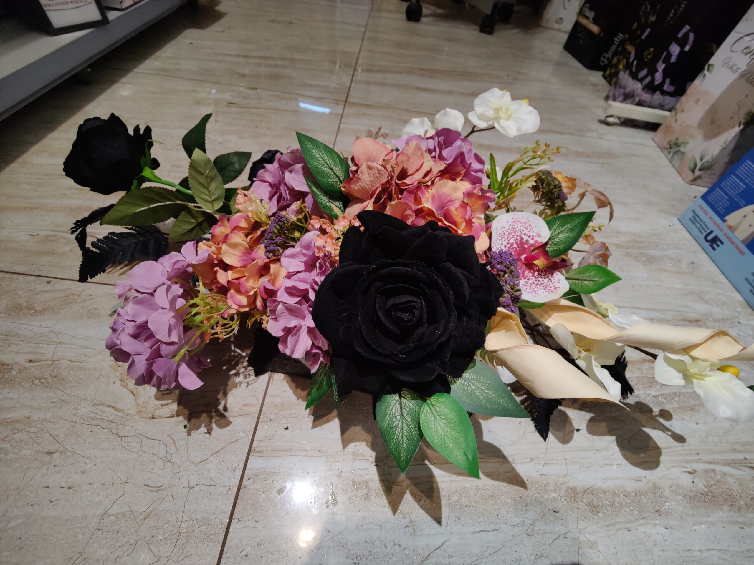 Ten elegancki stroik zachwyca kontrastem głęboko czarnych róż z delikatnymi hortensjami w odcieniu różu i pomarańczy, przeplatanymi białymi orchideami. Zielone liście dodają świeżości, tworząc harmonijną i wyrafinowaną dekorację o tajemniczym uroku