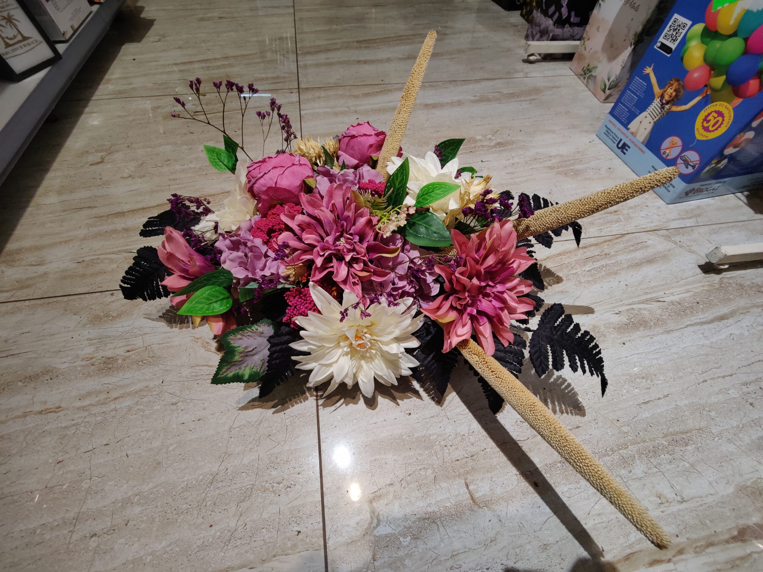 Ten efektowny stroik zachwyca bogactwem barw i tekstur. Składa się z intensywnie różowych i purpurowych dalii oraz delikatnychh białych chryzantem, które tworzą żywy kontrast. Zielone liście i czarne akcenty paproci dodają głębi, a długie beżowe łodygi wnoszą nietypowy, dekoracyjny akcent. Całość emanuje elegancją i nowoczesnym stylem, idealną na każdy nagrobek