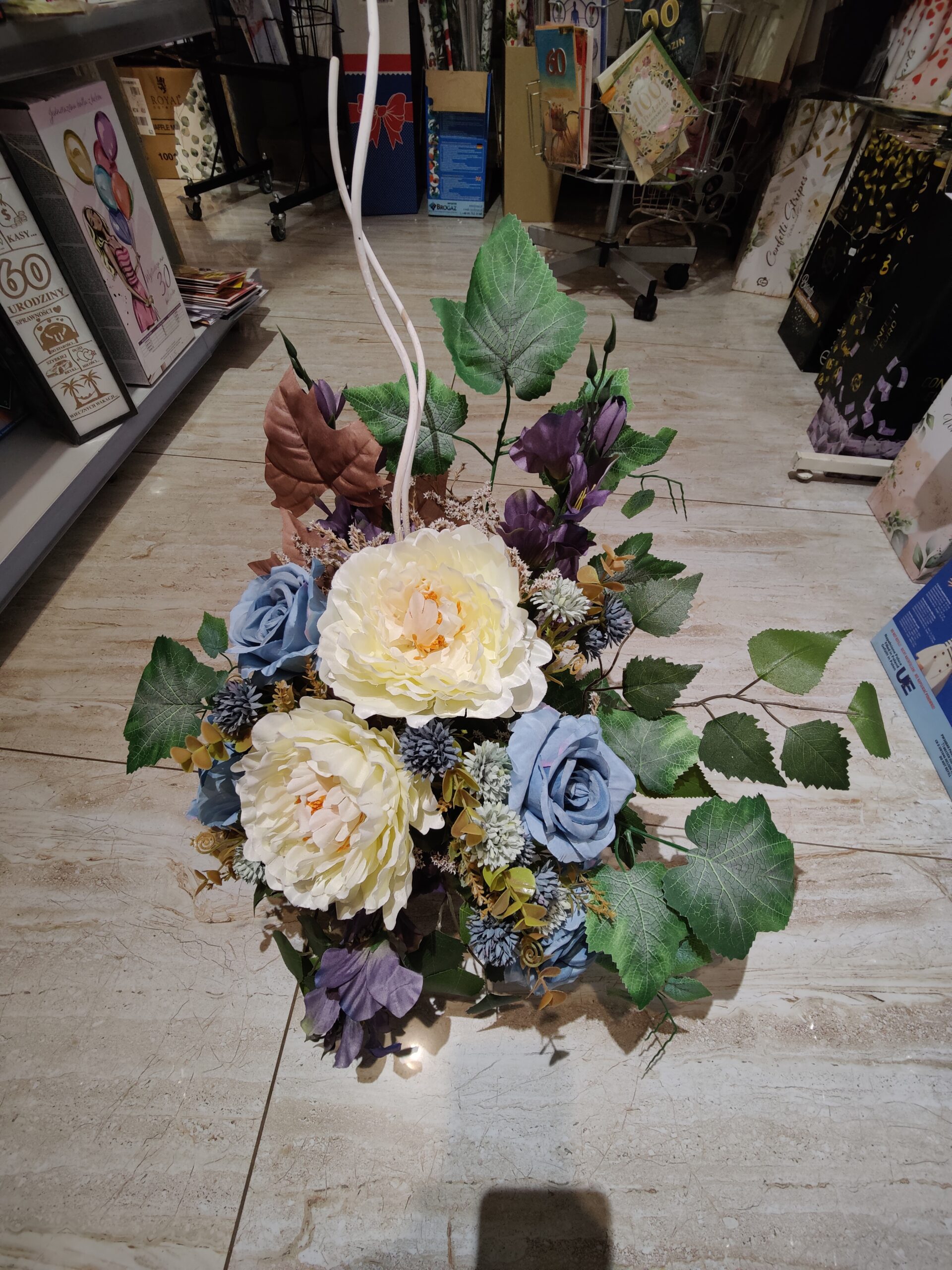 Stroik składa się ze sztucznych kwiatów w odcieniach kremowych, niebieskich i fioletowych, z dominującymi dużymi pąkami oraz różami. Uzupełniony jest zielonymi liśćmi i dekoracyjnymi gałązkami co tworzy go wyjątkową ozdobą nagrobną