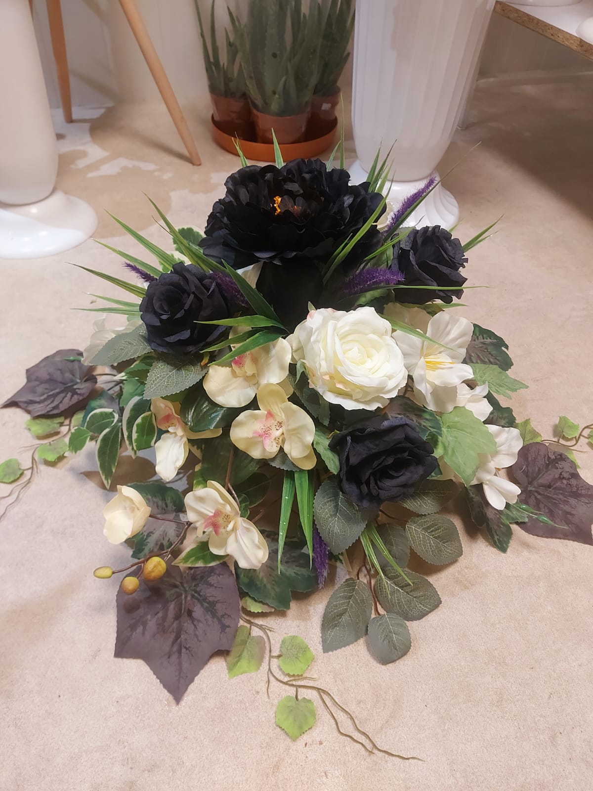 Ten stroik to elegancka kompozycja z ciemno – purpurowych i czarnych róż, kontrastujących z białymi i kremowymi kwiatami. Urozmaicona jest zielonymi liśćmi i delikatnymi akcentami fioletu, co nadaje jej głębokiego, wyrafinowanego charakteru
