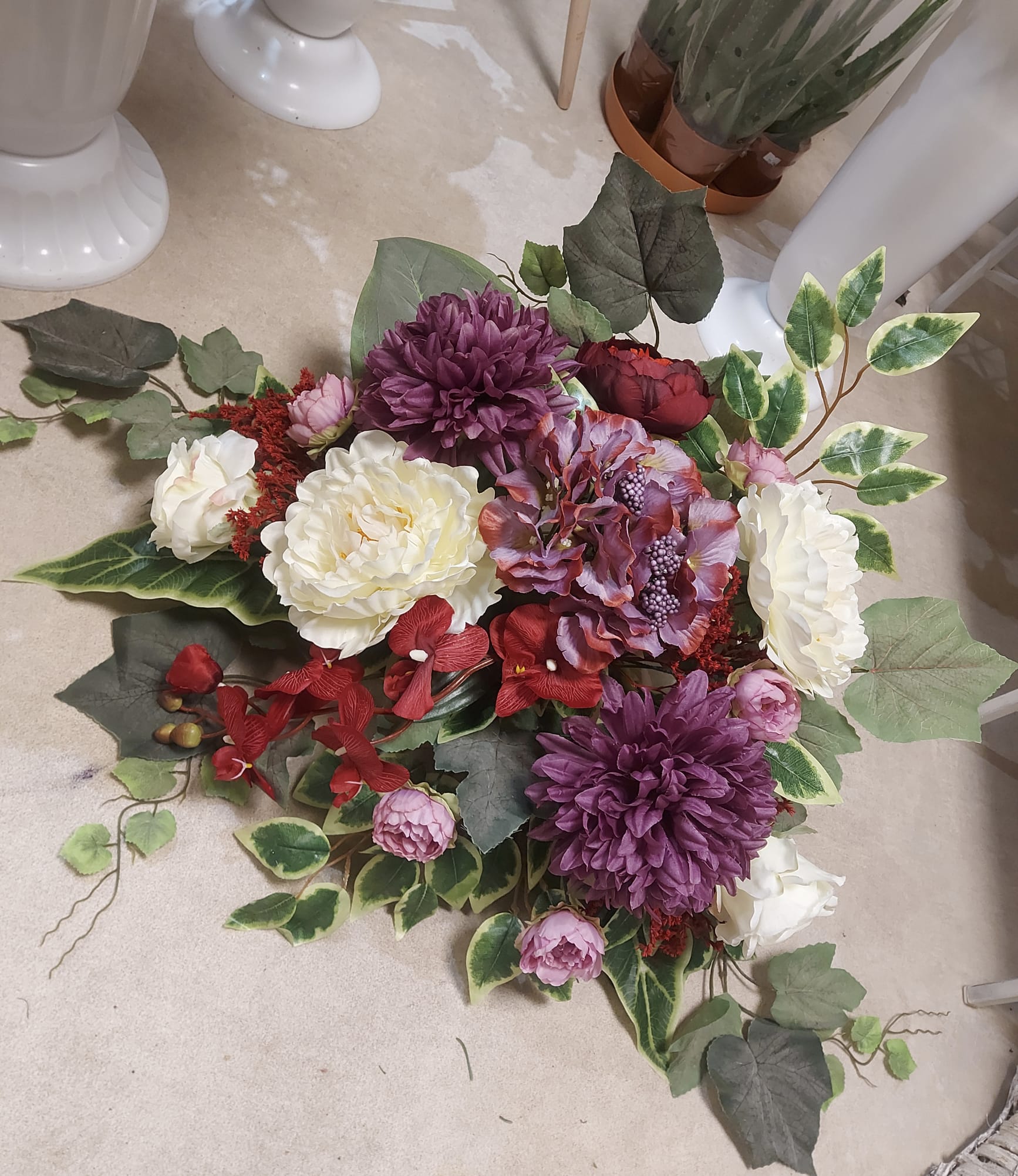 Ten stroik to bogata kompozycja z purpurowych i czerwonych kwiatów, takich jak piwonie i orchidee, przeplatana białymi akcentami. Uzupełniona zielonymi liśćmi i delikatnymi pnączami, tworzy elegancki i harmonijny układ