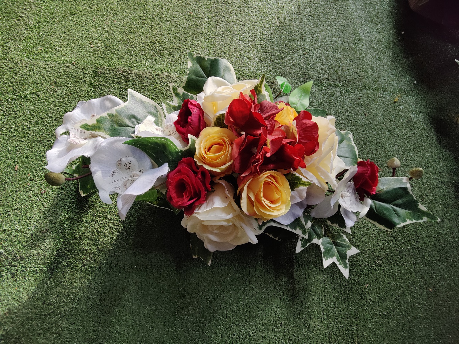 Stroik składa się ze sztucznych kwiatów w tym czerwonych, żółtych i białych róż oraz białych orchidei. Uzupełnieniem są zielone liście z białymi brzegami. Całość tworzy kolorową i harmonijną aranżacje