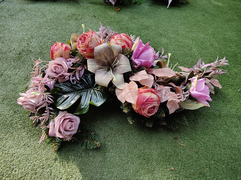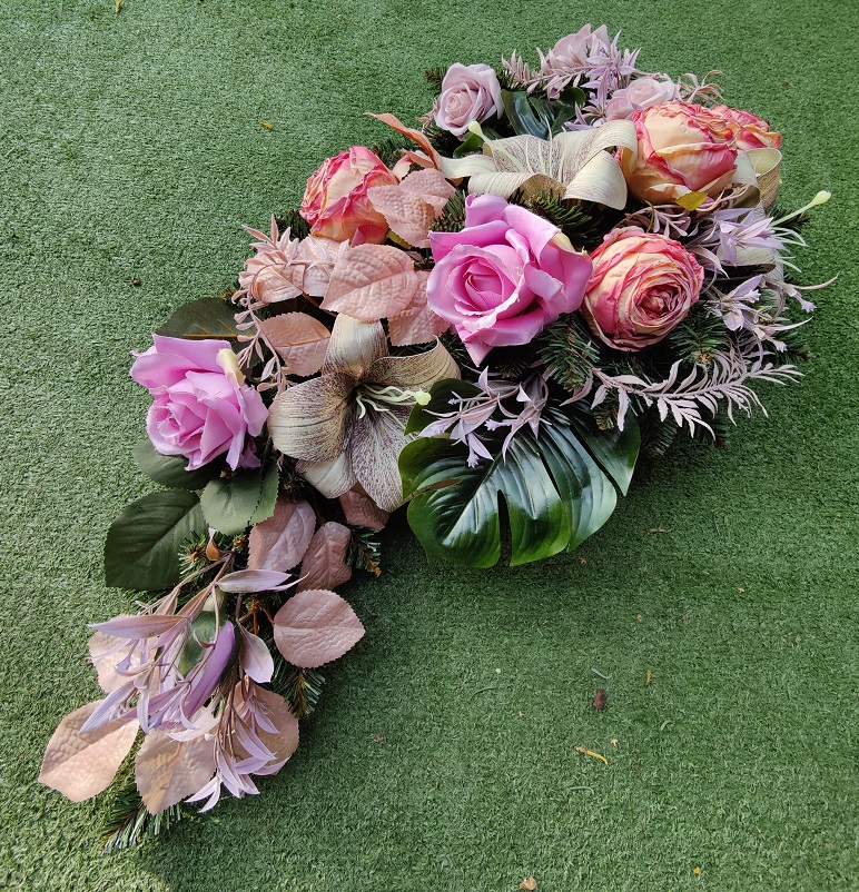 Stroik składa się z różnorodnych sztucznych kwiatów, głównie róż w odcieniach łososiowych, różowych, kremowych, lilii oraz innych kwiatów o delikatnych, pastelowych barwach. Centralnym elementem jest duży, beżowo-brązowy kwiat lilii o szerokich płatkach. Całość uzupełniają zielone liście, w tym szerokie, błyszczące monstery oraz drobne gałązki iglaste. Kompozycja jest harmonijna i elegancka. Kompozycja stworzona jest w wersji dużej, przeznaczona do ułożenia jej wzdłuż pomnika lub po skosie.