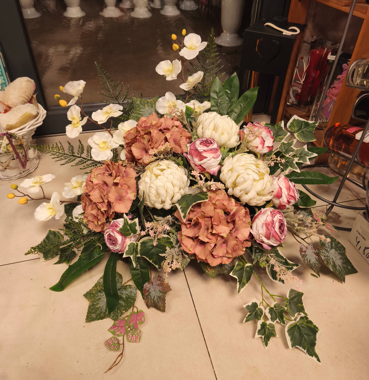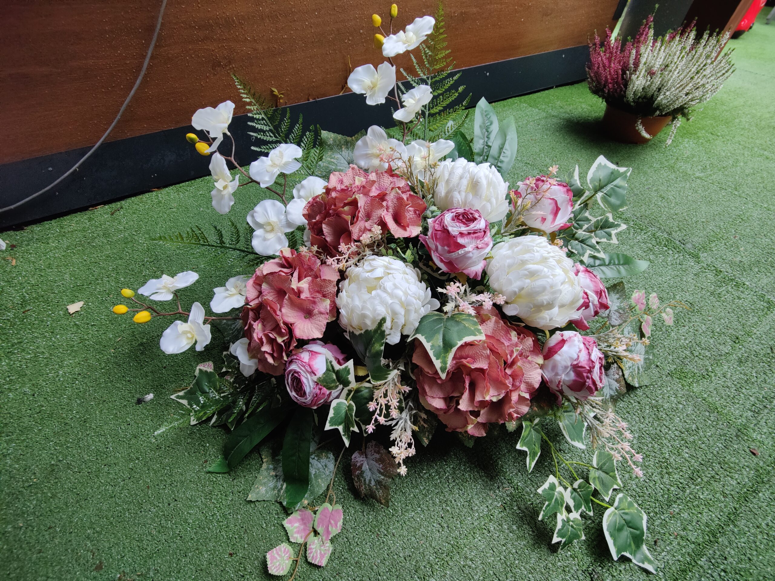 Ten uroczy stroik zachwyca harmonijnym połączeniem białych orchidei i różowych peonii oraz róż, oplecionych zielonymi liśćmi z białymi akcentami. Na grobie będzie prezentował się elegancko i naturalnie
