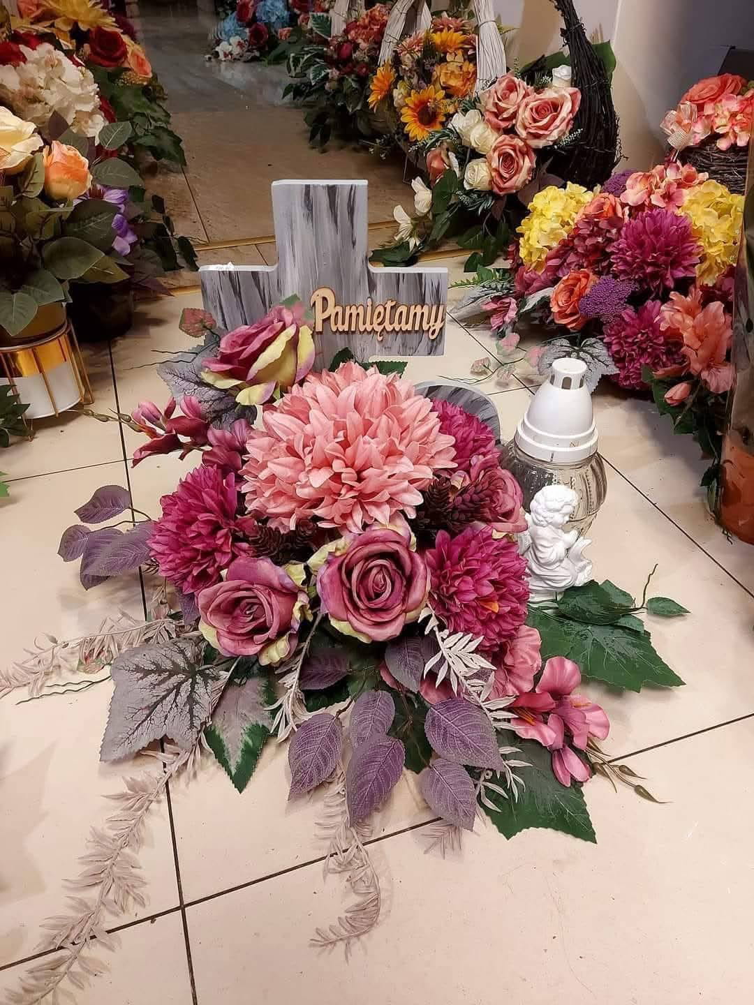 Ten poruszający zestaw składa się z eleganckiego stroika i uroczego znicza w kształcie aniołka. Stroik zachwyca delikatną kompozycją róż, chryzantem i hortensji w odcieniach różu i fioletu, oplecioną zielonymi liśćmi i trawami. Umieszczony napis na drewnianym krzyżu ” Pamiętamy ” tworzy wzruszającą dekorację a znicz dodaje mu ciepłego , symbolicznego akcentu, idealnego na zadumane chwile pamięci