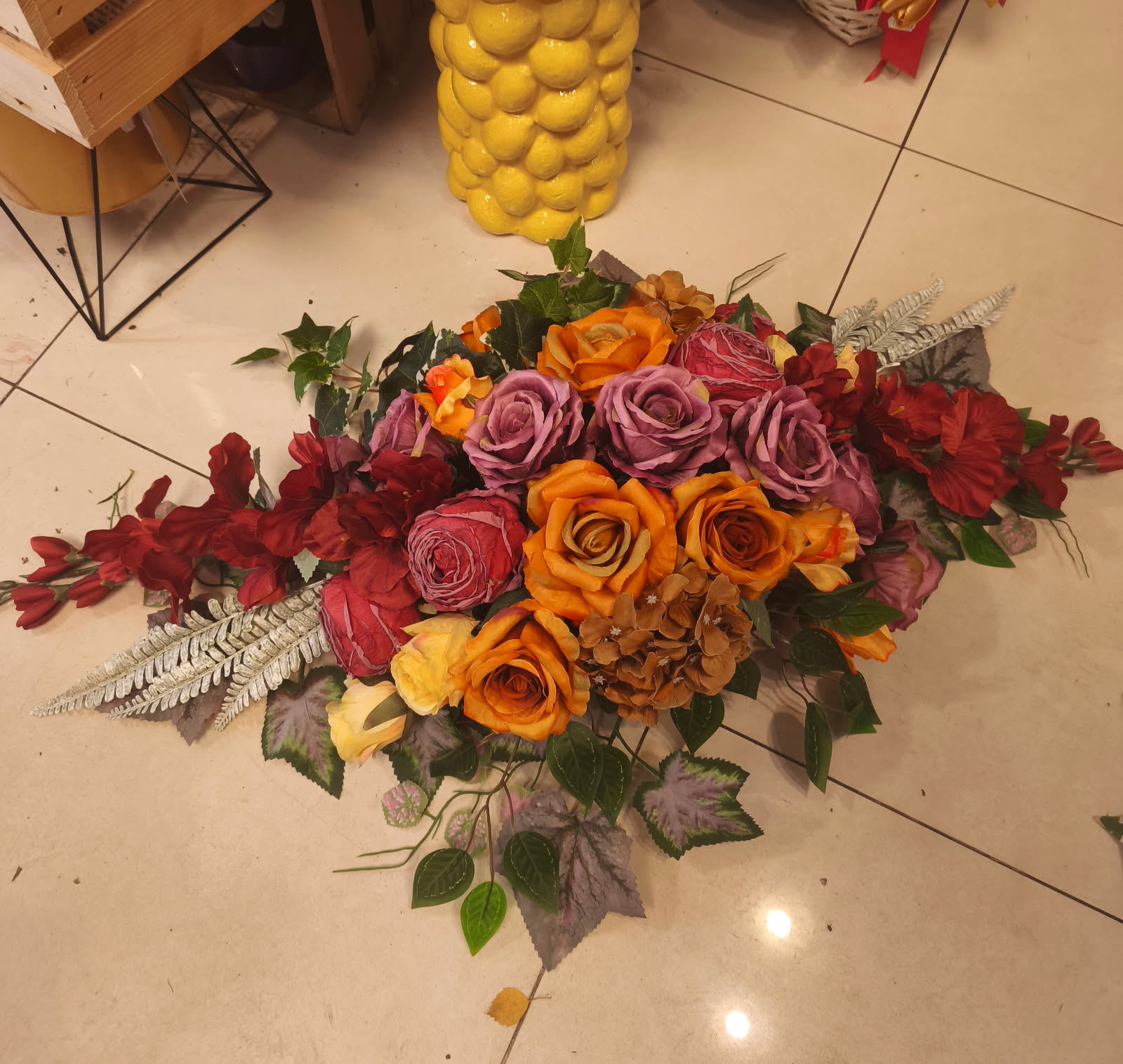 Uroczy stroik w odcieniach pomarańczy, czerwieni, fioletu i żółci, złożony z pięknych róż, hortensji i zielonych liści z subtelnymi akcentami srebrzystych piór. Kompozycja zachwyca bogactwem kolorów i naturalnym urokiem, idealna do dekoracji nagrobka