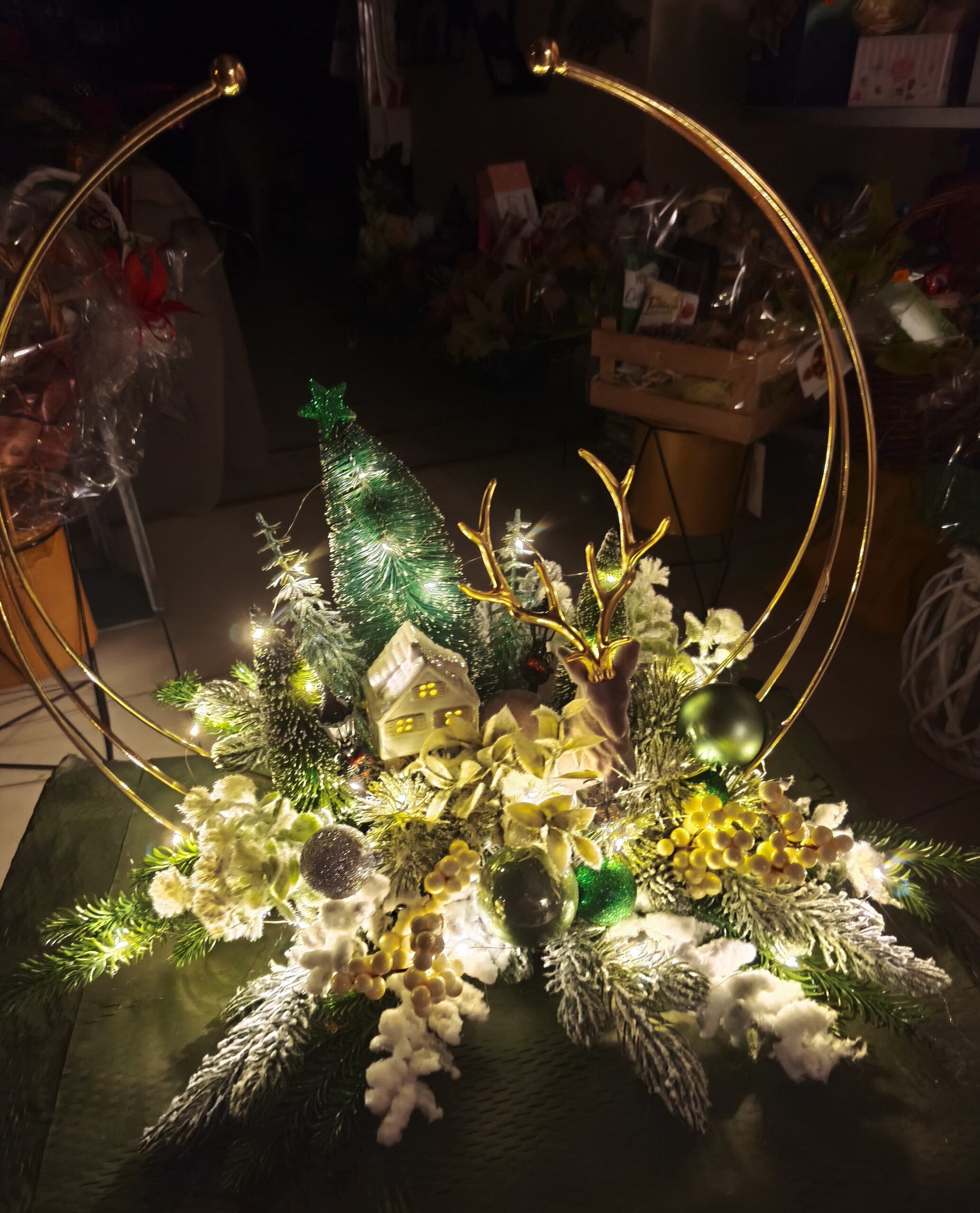 Przepiękny stroik świąteczny pełny blasku i ciepłego światła .Kompozycja stworzona jest na podstawie wizji krajobrazu leśnego, umiejętnie ułożonych elementów dekoracyjnych na okrągłej metalowej podstawie w złotym kolorze. Dekoracja skomponowana jest w kolorystyce zielono, biało, złotej ze sztucznego ośnieżonego igliwia z głównym elementem kompozycji, którym jest figurka jelenia ze złotym porożem oraz ceramiczny zimowy domek ze światełkiem led. Całość kompozycji owinięta jest długą cienką żyłką z ciepłymi lampkami led , który to podświetla całość zimowego leśnego krajobrazu.