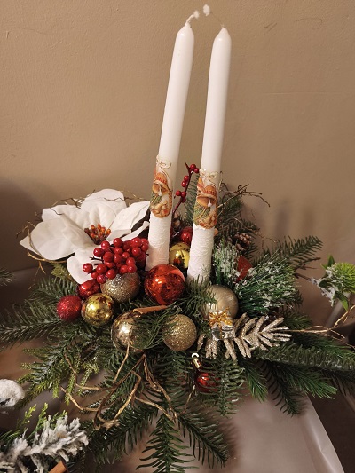 Klasyczny, elegancki stroik z imitacji żywej jodły, ozdobiony białą gwiazdą betlejemską, czerwonymi i złotymi bombkami, jarzębiną, cynamonem i błyszczącymi akcentami. Dwie wysokie świece z motywem dzwoneczków dodają magii wigilijnemu stołowi.