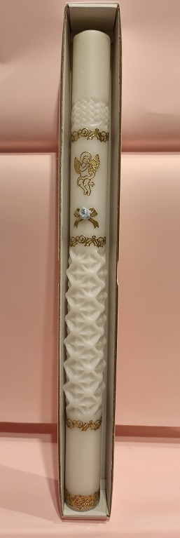 Biała, reliefowa świeca w ozdobnym opakowaniu – idealna pamiątka na Chrzest Święty.