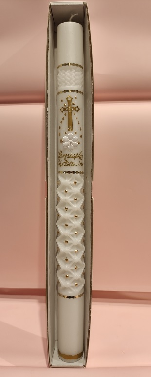 Biała, reliefowa świeca w prostym, eleganckim opakowaniu – ponadczasowa pamiątka na Chrzest Święty.