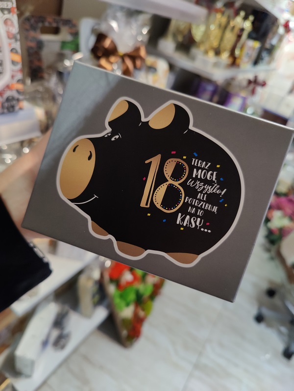 Czarna, ceramiczna świnka skarbonka na 18te urodziny, idealna na śmieszny prezent. Pakowana w ozdobny kartonik. Wymiary 9cm x 12cm x 9cm