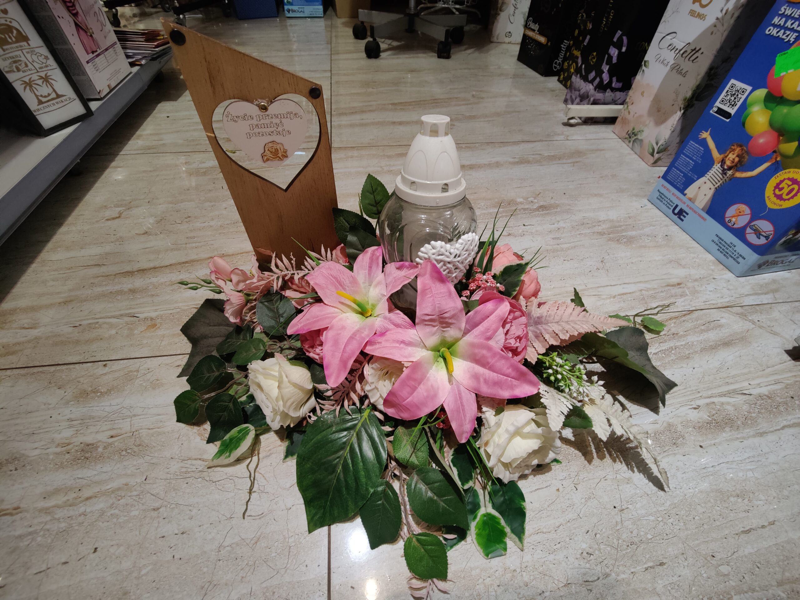 Uroczy stroik z różowymi liliami i białymi różami, otoczony zielonymi liśćmi. Dekorację uzupełnia drewniana tabliczka z sercem i sentencją oraz stylowy znicz, tworząc ciepły i elegancki akcent