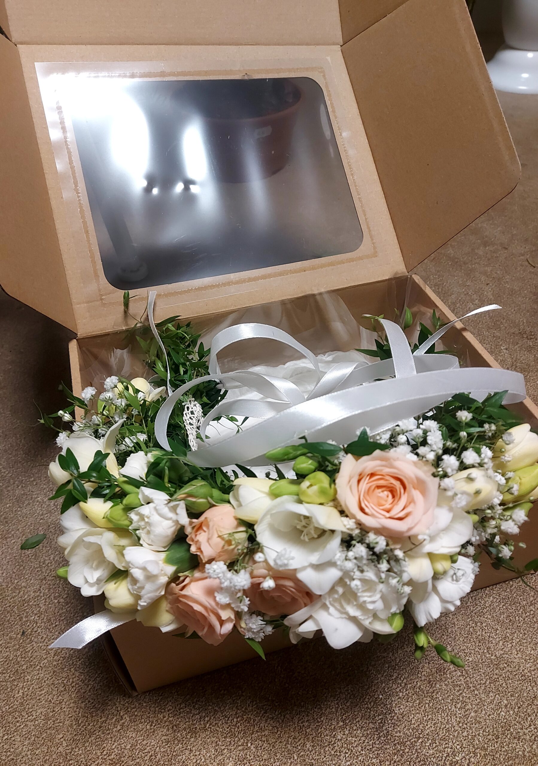Wianek komunijny wykonany przez naszych doświadczonych florystów z kwiatów frezji, róży gałązkowej, gipsówki oraz mirtu. Kwiaty na podkładzie zaplatane są na przemian z mirtą oraz gipsówką. Końcówki wianka owijane i zdobione są białą wstążką atlasową lub z organzy.