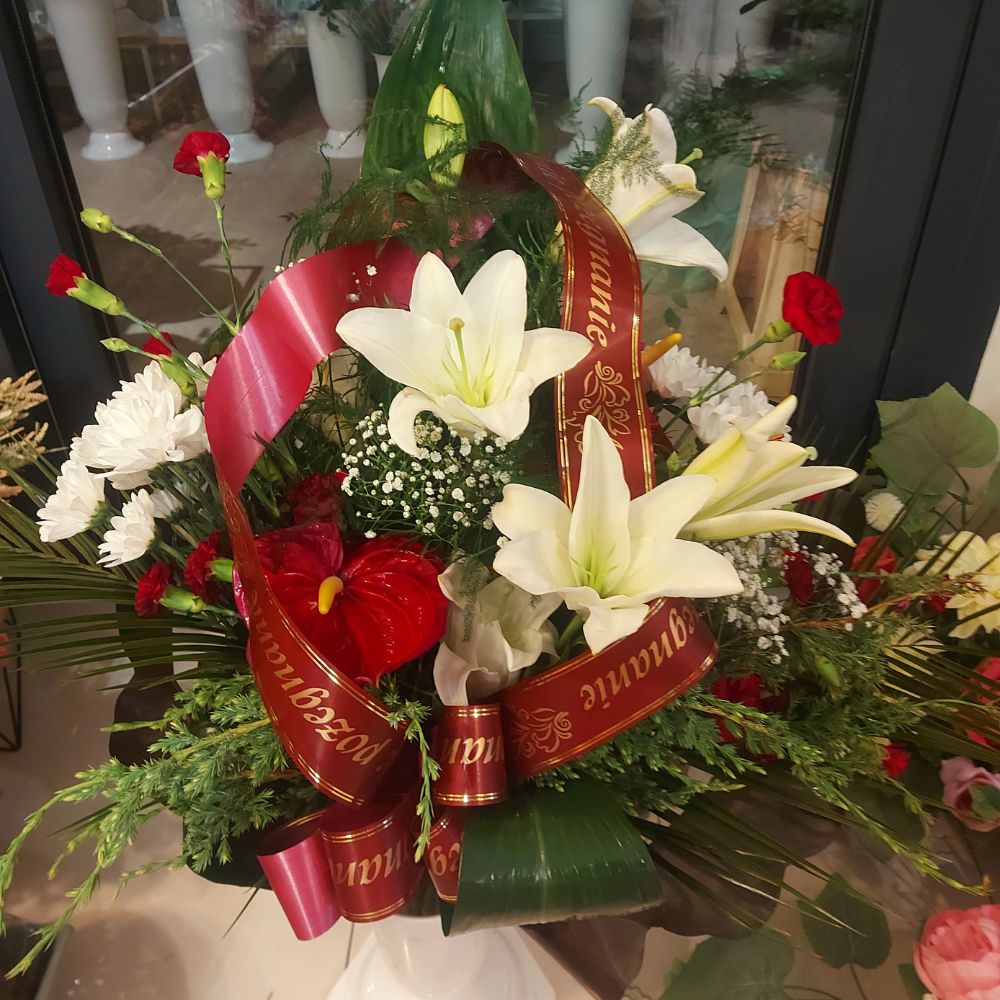 - Główne kwiaty: lilie, róże, gerbery, chryzantemy lub goździki – symboliczne i tradycyjne wybory w odcieniach bieli, kremu, czerwieni, różu lub innych kolorach na życzenie.