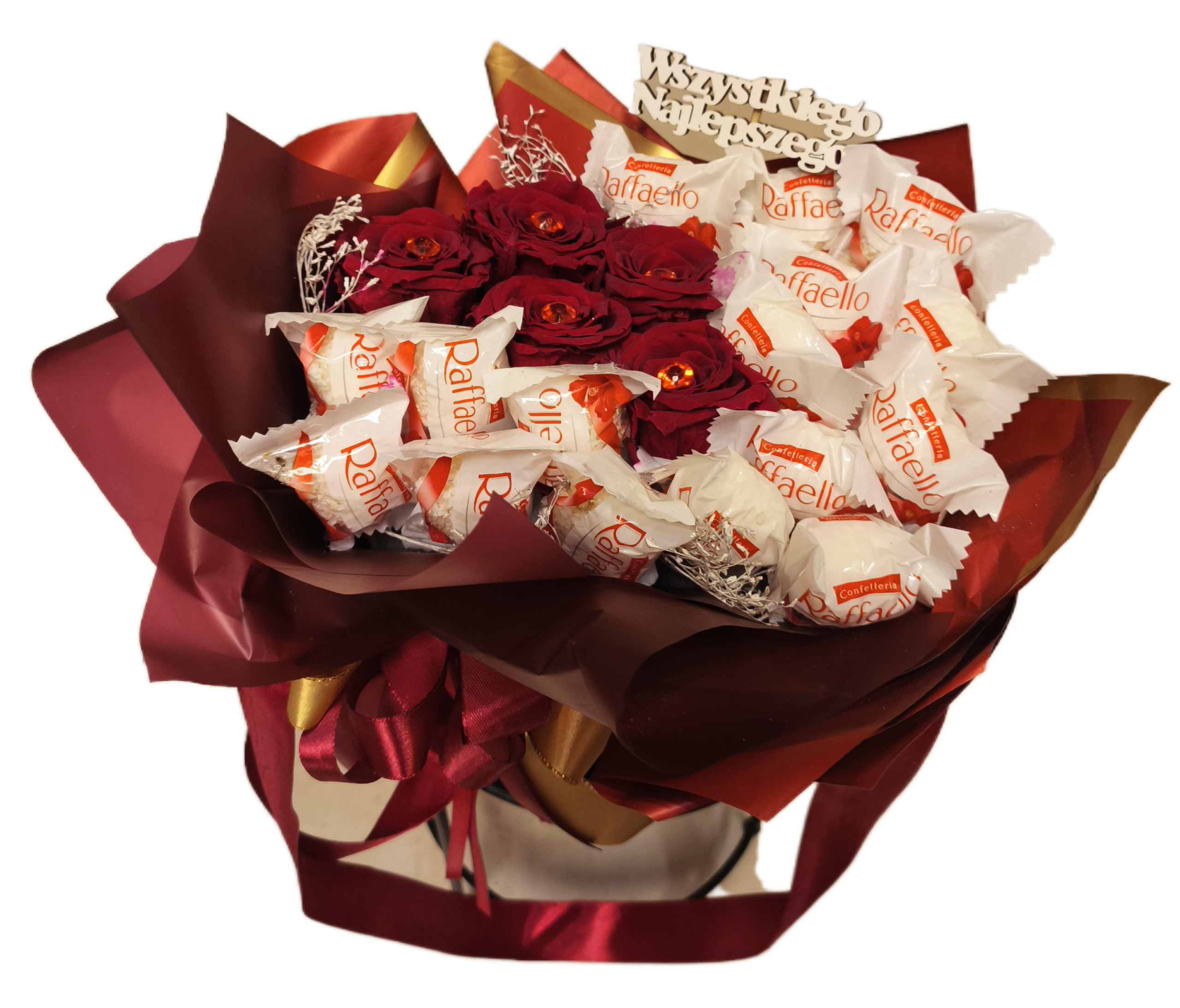 Elegancki klasyczny flouer box skomponowany z czerwonej wiecznej róży udekorowanej czerwonymi diamencikami oraz pralinek Raffaello .Kompozycja ułożona jest w eleganckim pudełku pokrytym delikatnym zamszem z praktycznymi uchwytami z atłasowej wstążki. Róże oraz praliny montowane są w suchej gąbce florystycznej ,klejone by zapobiec przemieszczaniu się elementów kompozycji. Całość kompozycji udekorowana jest eleganckim papierem florystycznym oraz atłasową kokardą w kolorze bordowym ze złotym paskiem nadającym wyjątkowego stylu klasycznej elegancji.