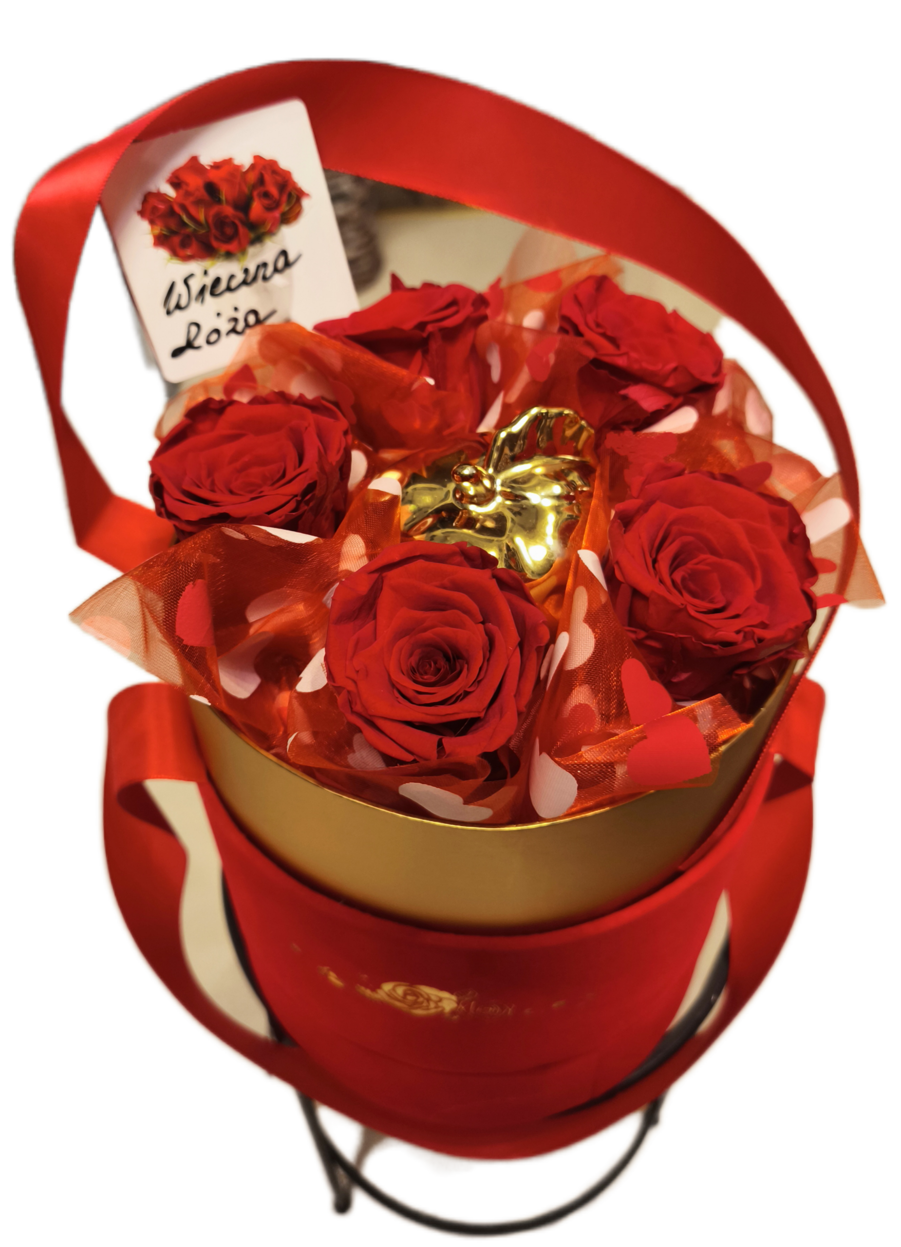 Intensywnie czerwone róże symbolizują miłość, pasję i elegancję, a centralnie umieszczony złoty element dekoracyjny w kształcie serca dodaje całości luksusowego charakteru. Do bukietu dołączona jest kartka z napisem „Wieczna Róża”, podkreślająca wyjątkowość kompozycji.