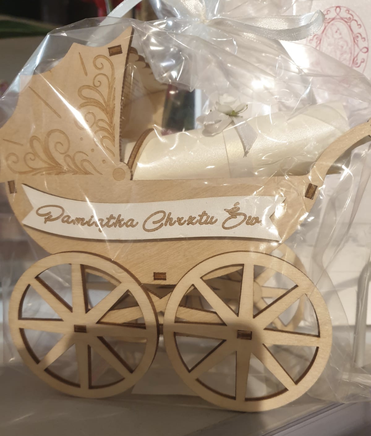 Drewniany wózeczek z tubą prezentową na Chrzest Święty dla chłopczyka i dziewczynki. Wózek wykonany jest z cienkiego drewna z wypalanym napisem Pamiątka Chrztu Świętego. Do wózka włożona jest dekoracyjna tuba na mały dodatkowy prezent ,która zawiera również karteczkę z życzeniami. Całość opakowana jest przezroczystą folią. Taka pamiątka z pewnością zachwyci rodziców maleństwa i będzie słodką dekoracją pokoiku dziecięcego na przyszłe kilka lat.