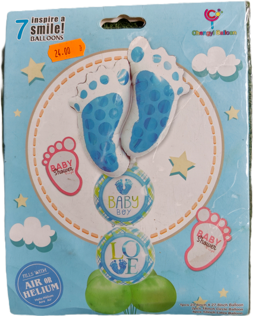 W skład zestawu wchodzą: 1szt. balon foliowy stopy 60x70cm, 2szt. balon foliowy okrągły 46cm, 4szt. balon latex 30cm