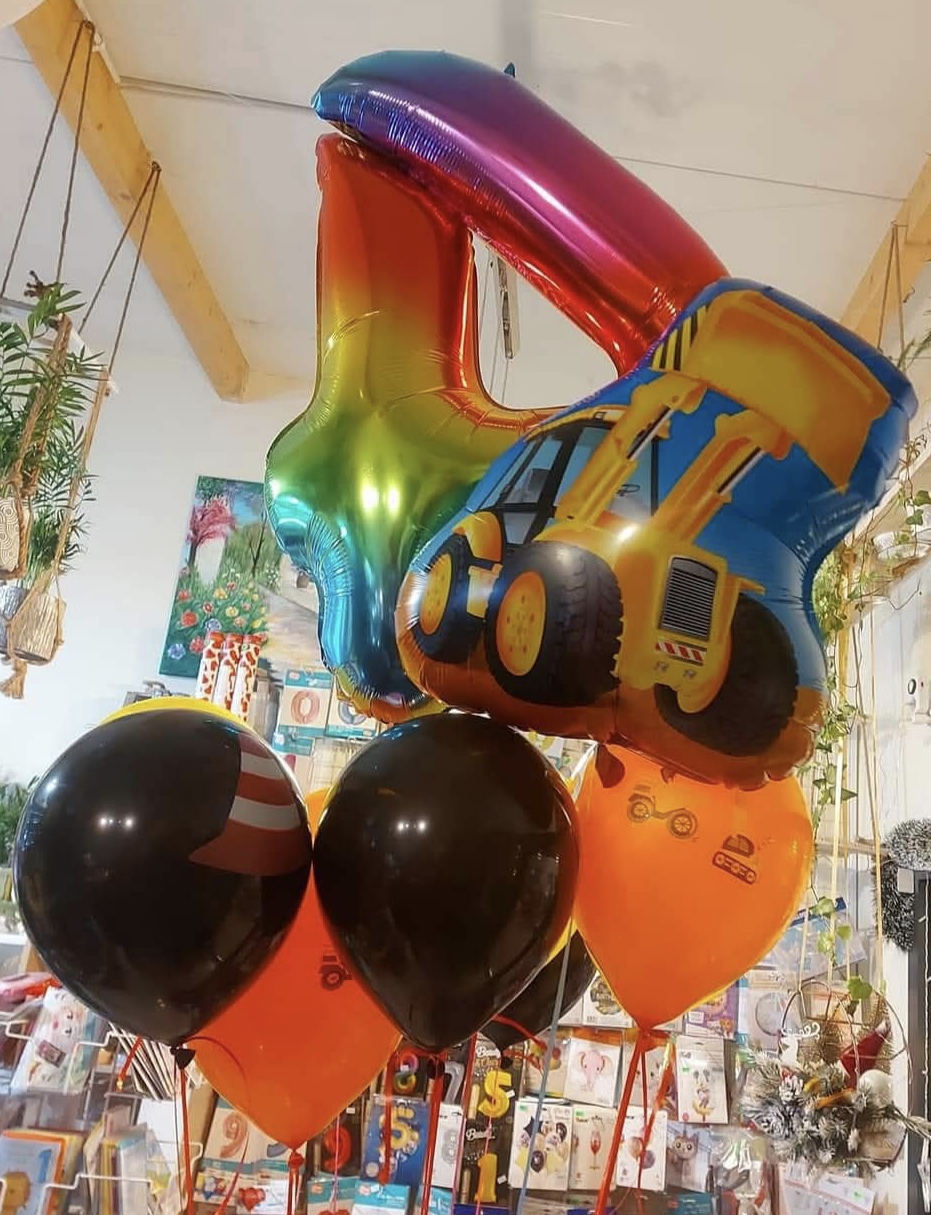 Kolorowy zestaw balonów z koparką dla dzieci .Jest to zestaw dwóch foliowych balonów oraz pięciu lateksowych przeznaczonych do napełniania helem.