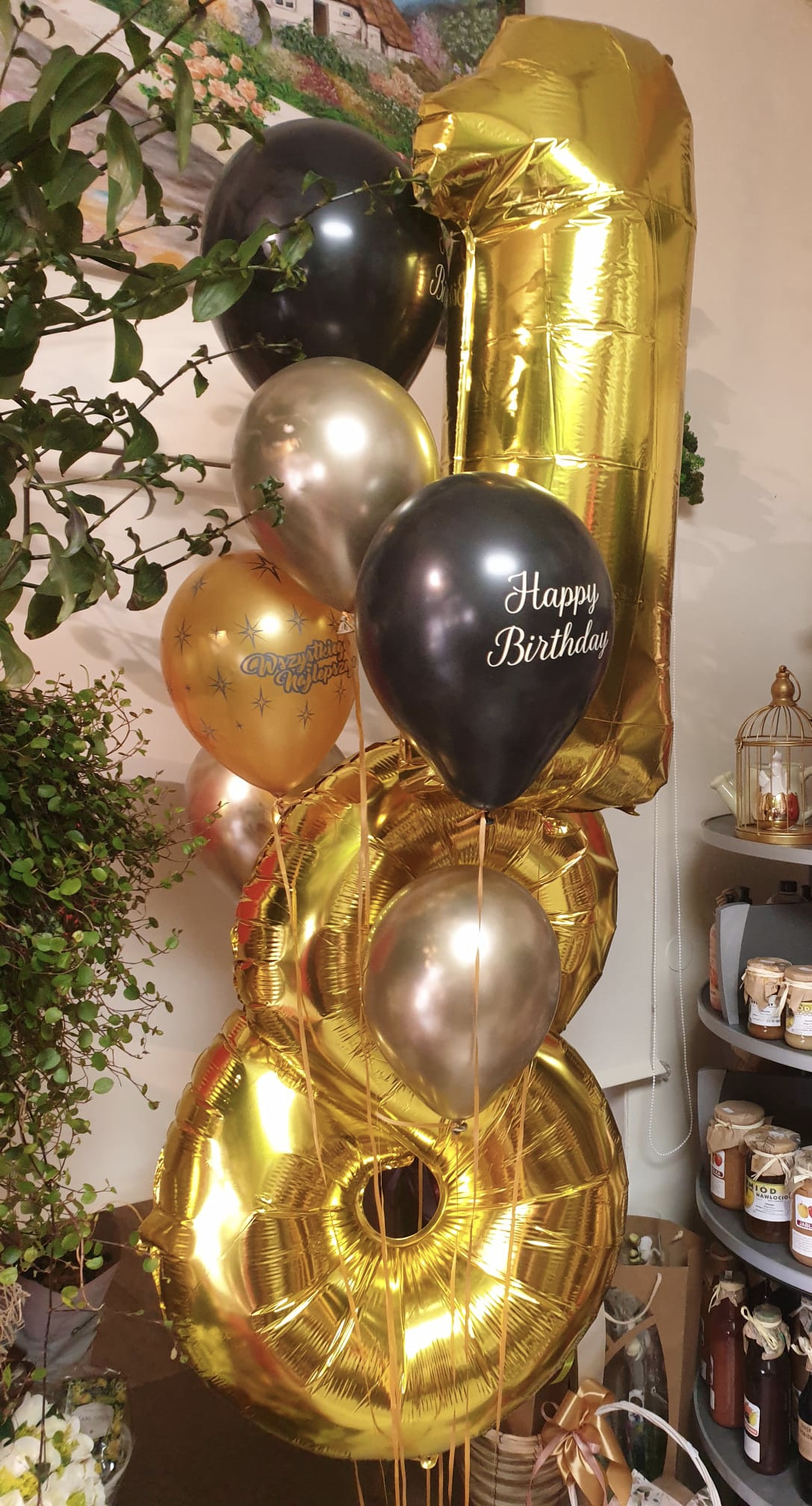 Zestaw balonów na 18 urodziny w kolorystyce złoto czarnej, składa się z ośmiu balonów;6 lateksowych 12″ w tym 2 z nadrukiem Happy Birthday i 2 foliowych cyfry 1 i 8 wielkości 76cm.Taki zestaw balonów elegancko udekoruje twoją salę imprezową a zarówno będzie idealnym bukietem balonowym jako prezent urodzinowy na 18 urodziny.